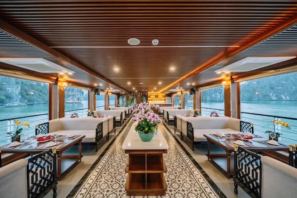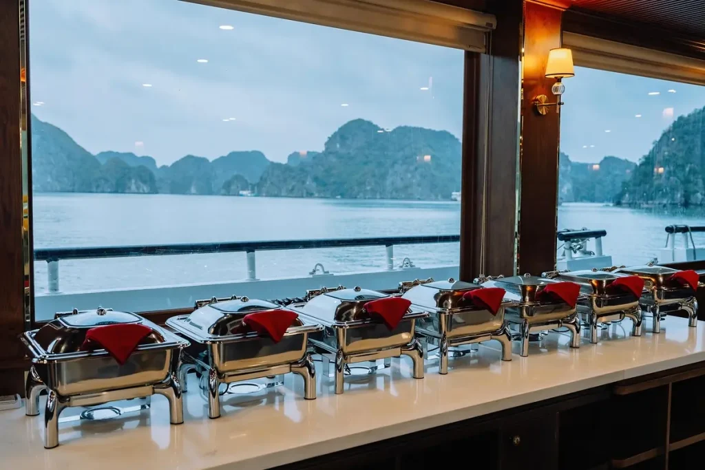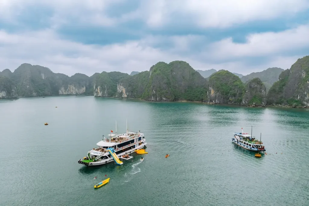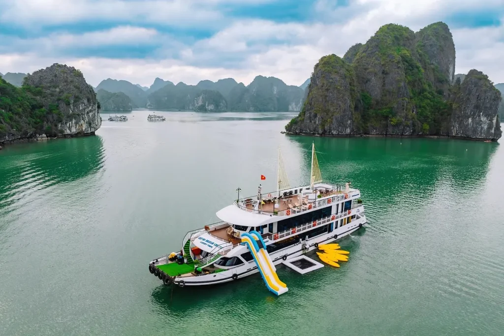 Tour Hoàng Hôn Vịnh Lan Hạ trên du thuyền 100 chỗ – ngắm hoàng hôn tuyệt đẹp giữa vịnh, chơi cầu trượt – bể lưới, chèo kayak và thưởng thức trái cây/đồ uống nhẹ. Khởi hành 14:45 từ Cát Bà.