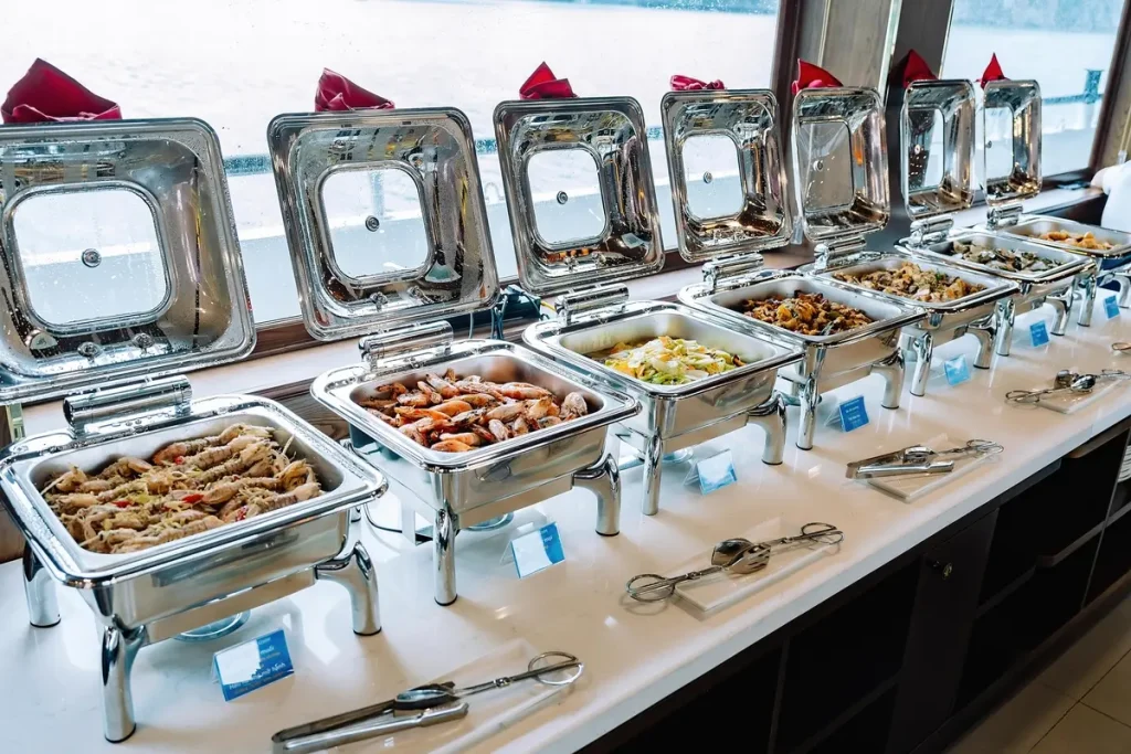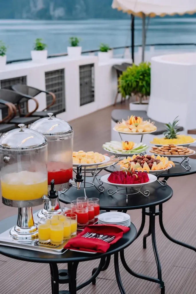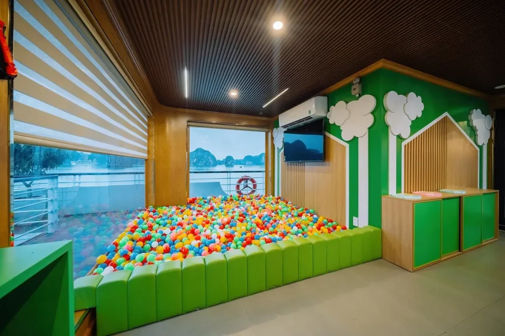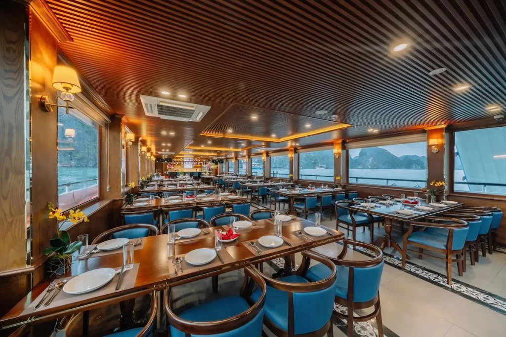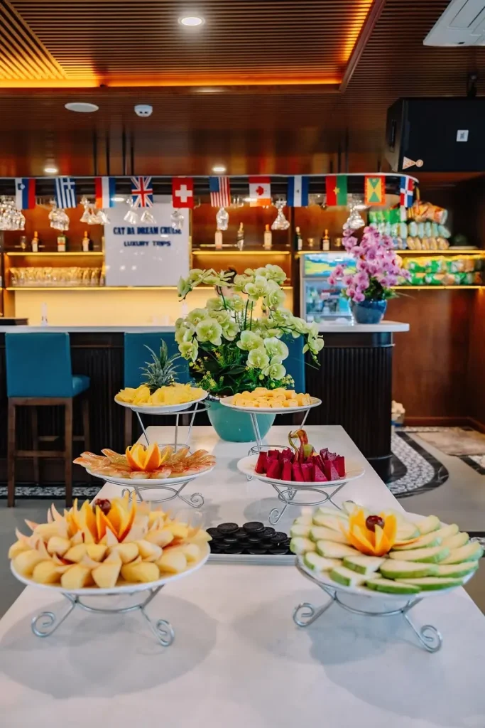 Tour Hoàng Hôn Vịnh Lan Hạ trên du thuyền 100 chỗ – ngắm hoàng hôn tuyệt đẹp giữa vịnh, chơi cầu trượt – bể lưới, chèo kayak và thưởng thức trái cây/đồ uống nhẹ. Khởi hành 14:45 từ Cát Bà.